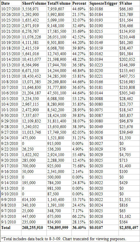 NEWPORT BEACH, Calif., Oct. 28, 2010 (GLOBE NEWSWIRE) -- BUYINS.NET, http://www.buyins.net, a leading provider of Regulation SHO compliance monitoring, short sale trading statistics and market integrity surveillance, has initiated coverage on Pacific Gold Corp (Pink Sheets:PCFG) after releasing the latest short sale data through October 27, 2010. The total aggregate number of shares shorted since August 3, 2009 is approximately 268 million shares. Approximately 36.4% of daily trading volume is short selling. The SqueezeTrigger price for all (Pink Sheets:PCFG) shares shorted is $0.0107. A short squeeze has already begun as stock currently at $.0205.