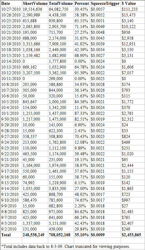 NEWPORT BEACH, Calif., October 29, 2010 (GLOBE NEWSWIRE) -- BUYINS.NET, http://www.buyins.net, a leading provider of Regulation SHO compliance monitoring, short sale trading statistics and market integrity surveillance, has updated coverage on Alternative Fuel Technologies (Pink Sheets:AFTC) after releasing the latest short sale data through October 27, 2010. The total aggregate number of shares shorted since August 2009 is approximately 248 million shares. 35.1% of daily volume is short selling. The SqueezeTrigger price for all (PinkSheets:AFTC) shares shorted is $.009. 47.94 million shares previously shorted below $.0046 have already begun squeezing.