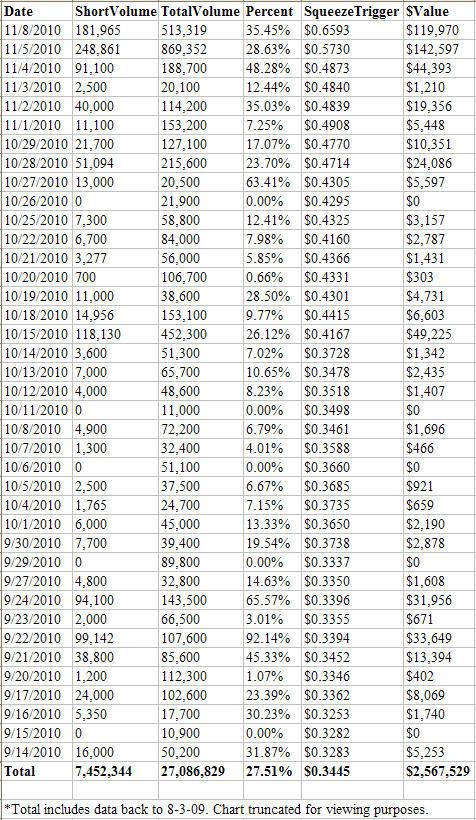 NEWPORT BEACH, Calif., Nov. 9, 2010 (GLOBE NEWSWIRE) -- BUYINS.NET, http://www.buyins.net, a leading provider of Regulation SHO compliance monitoring, short sale trading statistics and market integrity surveillance, has updated coverage on SAMEX MINING (OTCBB:SMXMF) after releasing the latest short sale data through November 8, 2010. The total aggregate number of shares shorted since August 2009 is approximately 7.45 million shares. An average of 27.51% of daily volume is short selling. The SqueezeTrigger price for all (OTCBB:SMXMF) shares shorted is $0.34. A short squeeze has begun as stock above its $0.34 SqueezeTrigger.