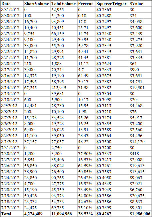 NEWPORT BEACH, Calif., Sept. 5, 2012 (GLOBE NEWSWIRE) -- BUYINS.NET, http://www.buyins.net, a leading provider of Regulation SHO compliance monitoring, short sale trading statistics and market integrity surveillance, has updated coverage on Sunshine Biopharma (OTC:SBFM) after releasing the latest short sale data through August 31, 2012. The total aggregate number of shares shorted since January 2010 is approximately 4.27 million shares. Approximately 38.5% of daily trading volume is short selling. The SqueezeTrigger price for all SBFM shares shorted is $0.47. A short squeeze is expected to begin when SBFM closes above its $0.47 SqueezeTrigger Price.