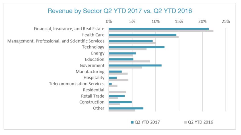 Revenue for Q2 2017 increased by $8.8 million (14.3%) over Q2 2016. This increase is attributable to a general increase in activity from small and medium-sized projects across a range of industry segments, including: healthcare, which increased from 13% of total revenue in Q2 2016 to 18% of total revenue in Q2 2017; technology, which increased from 7% of total revenue in Q2 2016 to 11% in Q2 2017; and energy and retail trade, each of which increased from 2% of total revenue in Q2 2016 to 5% in Q2 2017. In addition, the Company recorded installations revenue in Q2 2017 of $2.0 million compared with $0.3 million in Q2 2016.