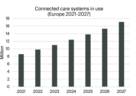 The total number of people using connected care solutions amounted to 8.6 million at the end of 2021, as there is an overlap between the three solution categories. The market is forecasted to grow at a CAGR of 12.1 percent during the next six years to reach 17.1 million connected care users by 2027.