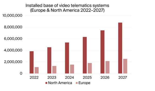 The analyst estimates that the installed base of active video telematics systems in North America reached almost 3.9 million units in 2022. Growing at a compound annual growth rate (CAGR) of 18.0 percent, the active installed base is forecasted to reach 8.8 million units in North America by 2027. In Europe, the installed base of active video telematics systems is estimated to be over 1.1 million units in 2022. The active installed base in the region is forecasted to grow at a CAGR of 17.9 percent to reach 2.5 million video telematics systems in 2027.