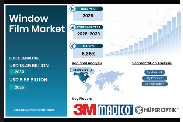 Austin, Dec. 20, 2025 (GLOBE NEWSWIRE) -- According to SNS Insider, The Window Film Market size is estimated at USD 8.86 Billion in 2025 and is expected to reach USD 13.45 Billion by 2033, growing at a CAGR of 5.35% during 2026–2033. The growing need for energy efficiency, UV protection, safety, and aesthetic improvements in the commercial, residential, and automotive sectors is propelling the window film market's rapid expansion. The industry is changing as a result of technological developments in ceramic, polyester, and dyed films, and as design customization and sustainability trends lead to an expansion of decorative and commercial uses.
