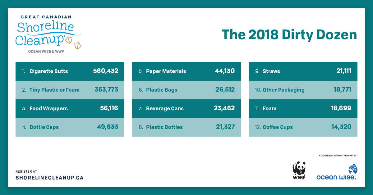 VANCOUVER, B.C, May 09, 2019 (GLOBE NEWSWIRE) -- Cigarette butts have returned to the top of the Dirty Dozen list, with a staggering 560,432 cigarette butts found on Canadian shorelines in 2018. ...