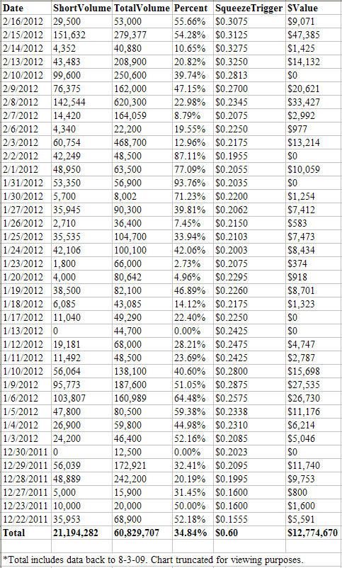 SqueezeTrigger - 30 billion cell database tracks EVERY short sale (not just total short interest) in all US stocks and calculates volume weighted price that a short squeeze will begin in each stock.