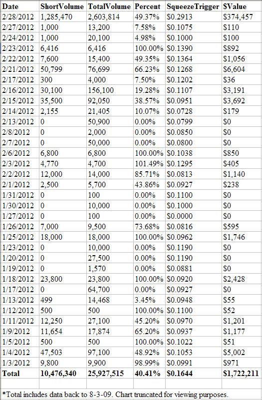 NEWPORT BEACH, Calif., Feb. 29, 2012 (GLOBE NEWSWIRE) -- BUYINS.NET, http://www.buyins.net, a leading provider of Regulation SHO compliance monitoring, short sale trading statistics and market integrity surveillance, has updated coverage on Power of the Dream Ventures (OTCBB:PWRV) after releasing the latest short sale data through February 28, 2012. The total aggregate number of shares shorted since August 2009 is approximately 10.47 million shares. Approximately 40.41% of daily trading volume is short selling. The SqueezeTrigger price for all PWRV (OTCBB:PWRV) shares shorted is $.164. A short squeeze has begun as the stock is above its $.164 SqueezeTrigger Price.