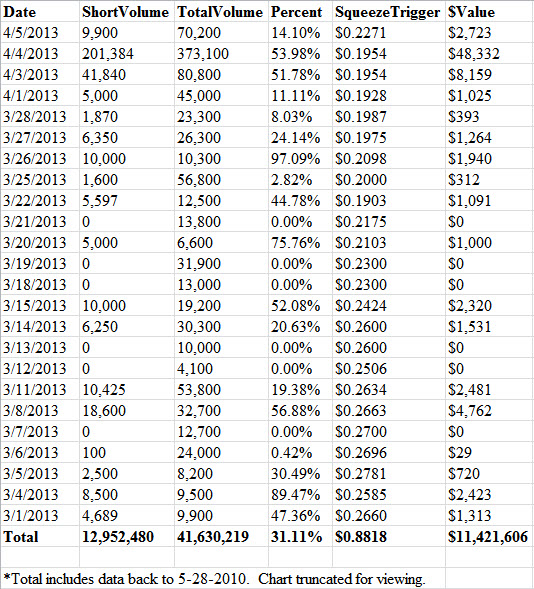 SqueezeTrigger - 37 billion cell database tracks EVERY short sale (not just total short interest) in all US stocks and calculates volume weighted price that a short squeeze will begin in each stock.