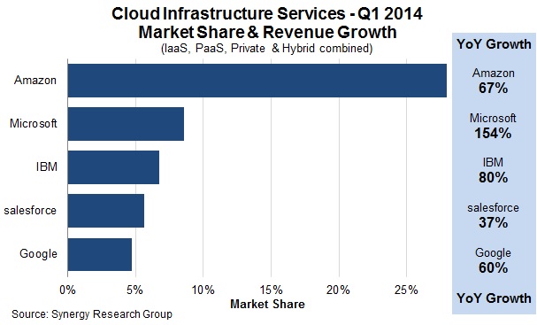 RENO, NV--(Marketwired - May 1, 2014) - New Q1 data from Synergy Research Group shows that Microsoft has grown its cloud infrastructure service revenues remarkably in the last year and is now pulling away from the pack of operators that are chasing Amazon (AWS). Amazon retains its dominant position, with greater market share than its four nearest rivals combined, but Microsoft has now established itself as the clear number two in the market.