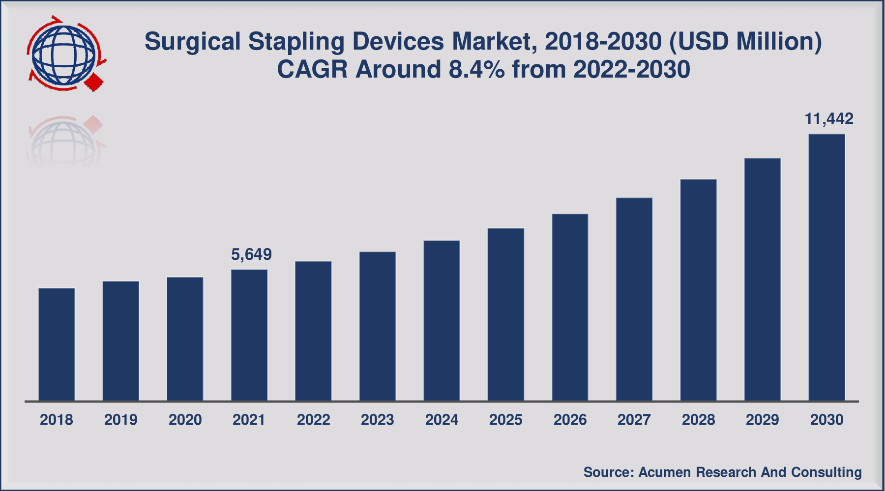 - Global surgical stapling devices market revenue was worth USD 5,649 Million in 2021, with a 8.4% CAGR from 2022 to 2030