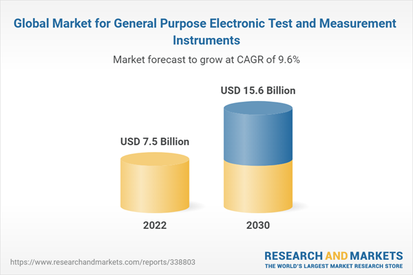 The global market for General Purpose Electronic Test and Measurement Instruments estimated at US$7.5 Billion in the year 2022, is projected to reach a revised size of US$15.6 Billion by 2030, growing at a CAGR of 9.6% over the analysis period 2022-2030.