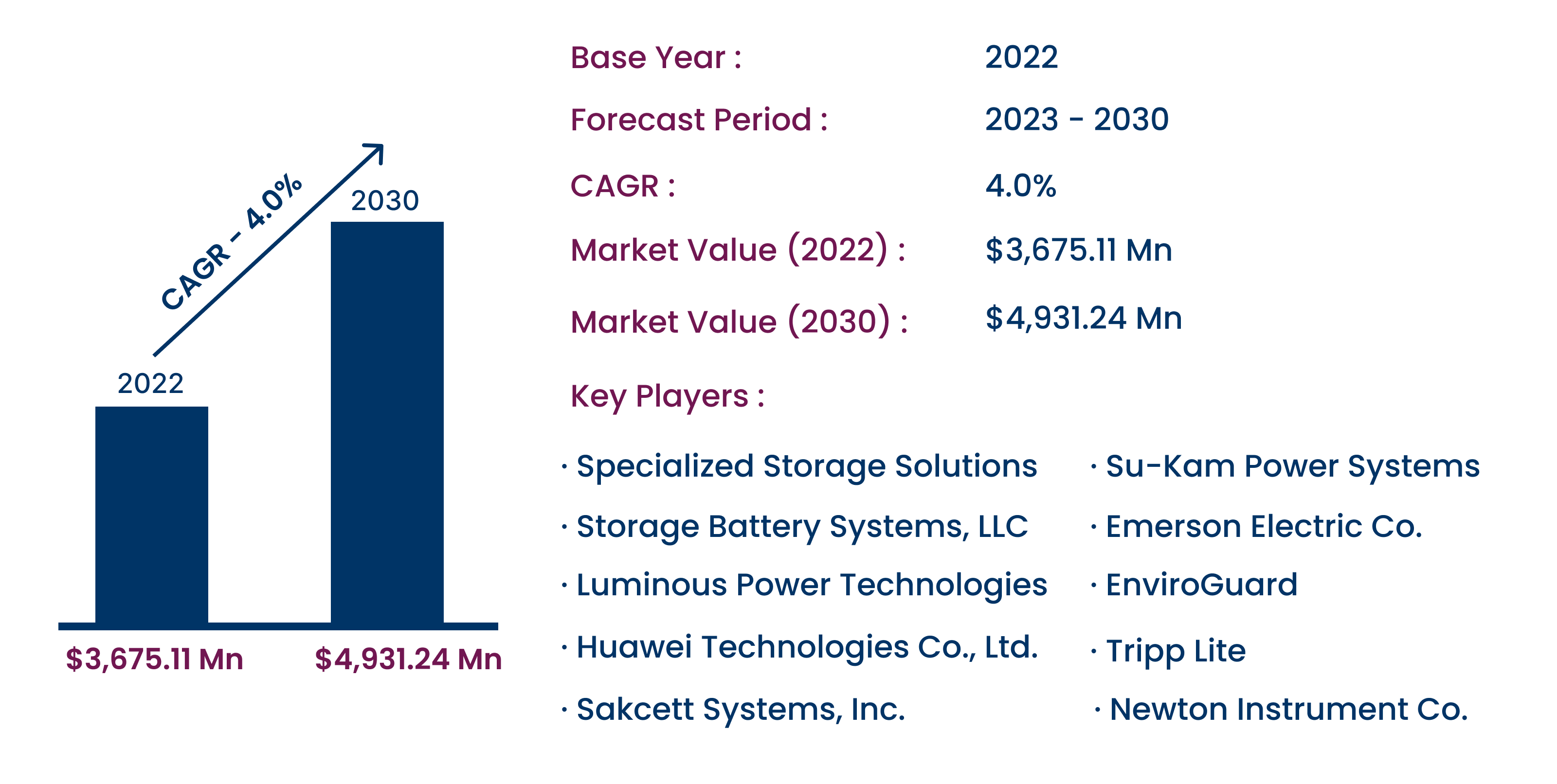 | Key Players | Emerson Electric Co., EnviroGuard, Huawei Technologies Co., Ltd., Luminous Power Technologies, Newton Instrument Co., Sakcett Systems, Inc., Specialized Storage Solutions, Storage Battery Systems, LLC, Su-Kam Power Systems, Tripp Lite |