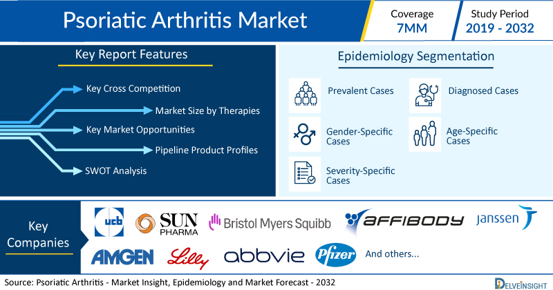 DelveInsight’s Psoriatic Arthritis Market Insights report includes a comprehensive understanding of current treatment practices, psoriatic arthritis emerging drugs, market share of individual therapies, and current and forecasted market size from 2019 to 2032, segmented into 7MM [the United States, the EU-4 (Italy, Spain, France, and Germany), the United Kingdom, and Japan].