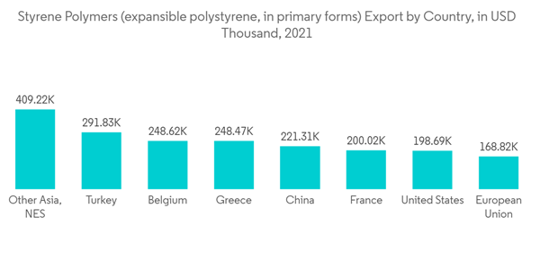 - According to World Bank, in 2021, the top exporters of styrene polymers were the Netherlands (USD 620,100.91 thousand), Turkey (USD 291,832.22 thousand), Belgium (USD 248,619.88 thousand), and Greece (USD 248,471.97 thousand).