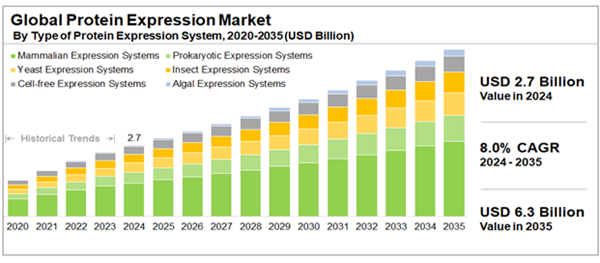 The Protein Expression Market is valued at USD 2.7 billion in 2024 growing at a CAGR of 8% during the forecast period 2024-2035.