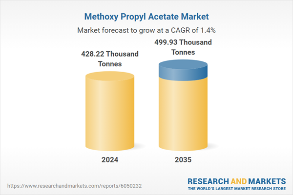 Global Methoxy Propyl Acetate Market was valued at 428.22 Thousand Tonnes in 2024 and is expected to reach 499.93 Thousand Tonnes by 2035 with a CAGR of 1.42% during the forecast period.
