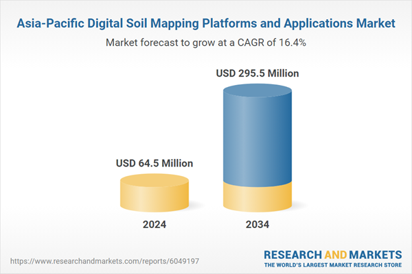 The Asia-Pacific digital soil mapping platforms and applications market was valued at $64.5 million in 2024 and is expected to reach $295.5 million by 2034, with a CAGR of 16.4% from 2024 to 2034.