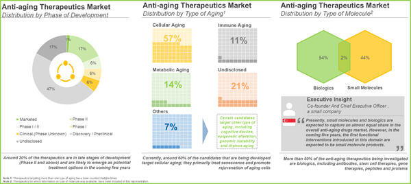 Researchers and innovators worldwide are focusing their efforts on the development of therapeutics that can extend life expectancy of an individual by targeting the pathophysiology of aging. Numerous start-ups and academic / research institutes globally are exploring a variety of anti-aging therapies at various stages of development. It is worth mentioning that anti-aging drug providing companies are using various methods, such as advancements in rigorous clinical trial services to expedite market approval procedure and incorporation of artificial intelligence to develop better anti-aging drugs. Additionally, technological advancements like organ-on-chip (promising alternative to conventional testing procedures) in the anti-aging domain has resulted in the development of targeted and effective longevity drugs. With the growing geriatric population, the ongoing R&D initiatives and the increasing funding investments, the anti-aging therapeutics market is expected to experience significant growth in the foreseen future.
