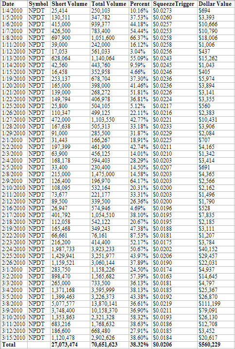 NEWPORT BEACH, Calif., March 17, 2010 (GLOBE NEWSWIRE) -- BUYINS.NET, http://www.buyins.net , a leading provider of Regulation SHO compliance monitoring, short sale trading statistics and market integrity surveillance, has initiated coverage on Newport Digital Technologies (OTCBB:NPDT) after releasing the latest short sale data through March 15, 2010. The total aggregate number of shares shorted in 2010 is approximately 27 million shares. The SqueezeTrigger price for all shares shorted is $0.0206. The next short squeeze is expected to begin when shares of (OTCBB:NPDT) close above $0.0175, where approximately 1.4 million shares shorted between $0.0163 and $0.0175 will be out-of-the-money.
