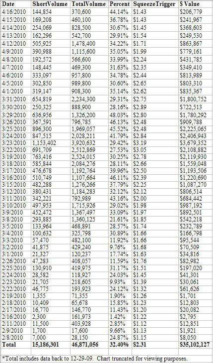 SqueezeTrigger -- 25 billion cell database tracks EVERY short sale (not just total short interest) in all U.S. stocks and calculates volume weighted price that a short squeeze will begin in each stock.