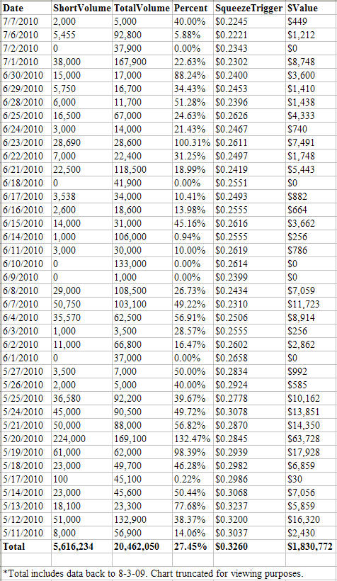 NEWPORT BEACH, Calif., July 8, 2010 (GLOBE NEWSWIRE) -- BUYINS.NET, http://www.buyins.net, a leading provider of Regulation SHO compliance monitoring, short sale trading statistics and market integrity surveillance, has initiated coverage on SAMEX MINING (OTCBB:SMXMF) after releasing the latest short sale data through July 7, 2010. The total aggregate number of shares shorted since August 2009 is approximately 5.61 million shares. The SqueezeTrigger price for all (OTCBB:SMXMF) shares shorted is $0.326. A short squeeze is expected to begin when SMXMF closes above $0.326.