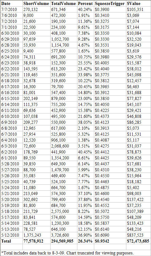 - Approximately 77.5 Million Shares Shorted Since August 2009