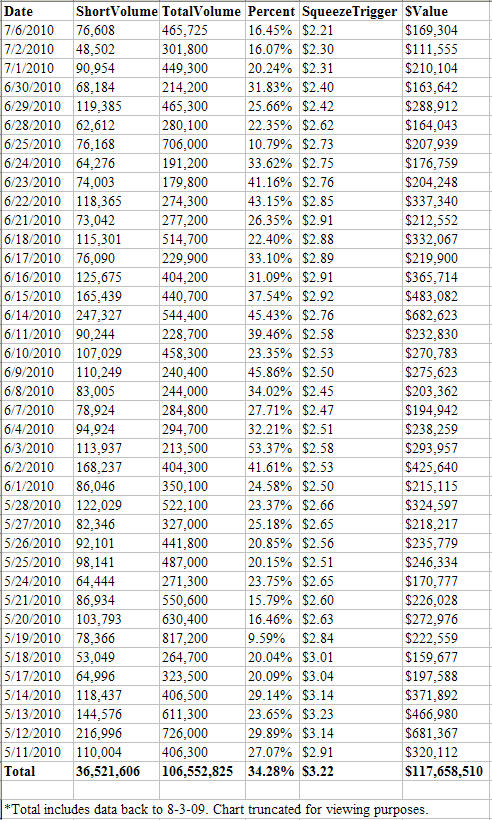 SqueezeTrigger -- 27 billion cell database tracks EVERY short sale (not just total short interest) in all US stocks and calculates volume weighted price that a short squeeze will begin in each stock.