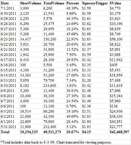 SqueezeTrigger -- 32 billion cell database tracks EVERY short sale (not just total short interest) in all US stocks and calculates volume weighted price that a short squeeze will begin in each stock.