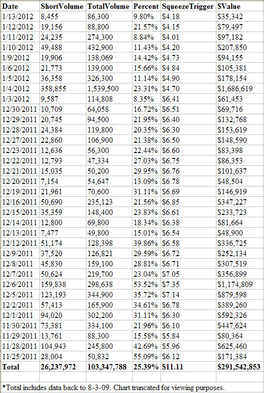 SqueezeTrigger - 31 billion cell database tracks EVERY short sale (not just total short interest) in all U.S. stocks and calculates volume-weighted price that a short squeeze will begin in each stock.