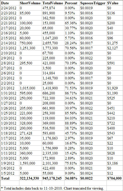 - Short Squeeze Expected When Stock Crosses $.0022 SqueezeTrigger Price