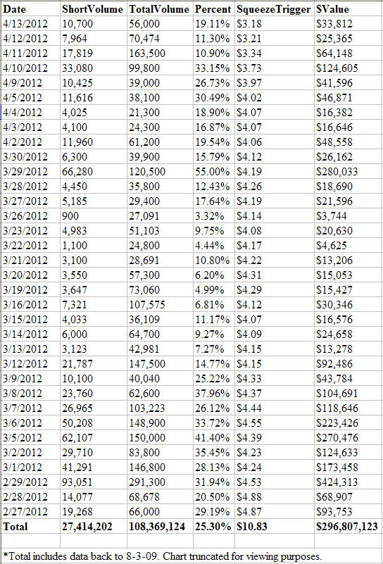 SqueezeTrigger - 31 billion cell database tracks EVERY short sale (not just total short interest) in all U.S. stocks and calculates volume-weighted price that a short squeeze will begin in each stock.