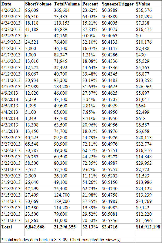 SqueezeTrigger - 37 billion cell database tracks EVERY short sale (not just total short interest) in all US stocks and calculates volume weighted price that a short squeeze will begin in each stock.
