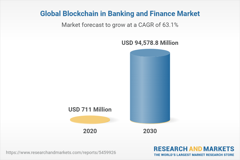 Dublin, March 31, 2022 (GLOBE NEWSWIRE) -- The "Global Blockchain in Banking and Finance Market 2020-2030 by Offering (Platform, Services), Type (Public, Private, Hybrid), Provider (Infrastructure, Middleware, Application), Application, Sub-vertical, Organization Size, and Region: Trend Forecast and Growth Opportunity" report has been added to ResearchAndMarkets.com's offering.
