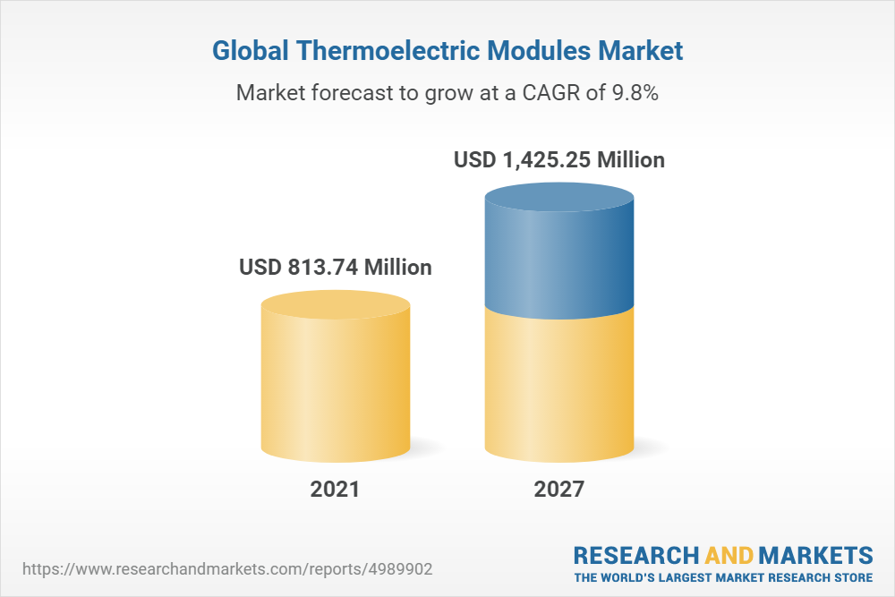 The Global Thermoelectric Modules Market size was estimated at USD 813.74 million in 2021, USD 891.97 million in 2022, and is projected to grow at a Compound Annual Growth Rate (CAGR) of 9.79% to reach USD 1,425.25 million by 2027.