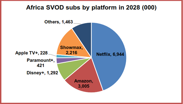 Netflix will have 6.94 million subscribers by 2028 - or 45% of the region's total. Disney+ will only have 1.29 million subscriptions by 2028, with roll-out expected to be restricted to Nigeria and South Africa. Paramount+ is only likely to start in South Africa. HBO has a distribution deal with Showmax.