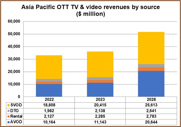 From the $19 billion additional OTT revenues, China will add $4 billion, India $2 billion, South Korea $3 billion and Japan $4 billion. China will account for 38% of the region's total revenues by 2028, down from 48% in 2022 as the other countries grow faster.