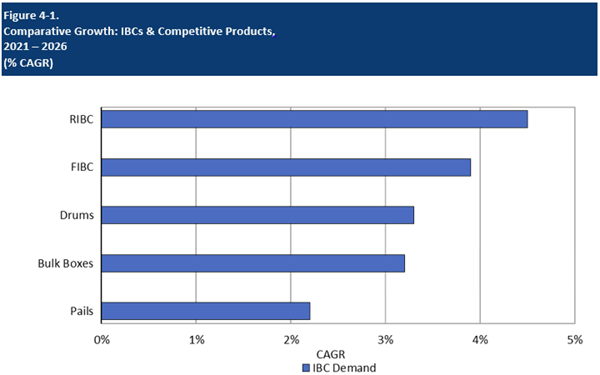 Rigid IBCs can be used for both liquids and dry flowable products. This versatility, among other performance advantages, will continue to contribute to their larger absolute gains through 2026. However, flexible IBCs lower cost will allow them to remain competitive in applications for which they are suitable, which include flowable powders (such as bulk food and pharmaceutical ingredients) as well as mined materials and other mineral products.