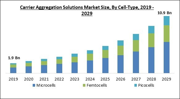 The global carrier aggregation solutions market is projected to reach a size of $10.9 billion by 2029, with a compound annual growth rate (CAGR) of 19.6% during the forecast period. The market growth is driven by the increasing focus on smart city initiatives by governments globally, leading to the adoption of carrier aggregation solutions in various smart city-enabled services. The emergence of cutting-edge technologies like artificial intelligence (AI) and the Internet of Things (IoT) has resulted in a surge in the number of connected devices, further driving the demand for carrier aggregation solutions.