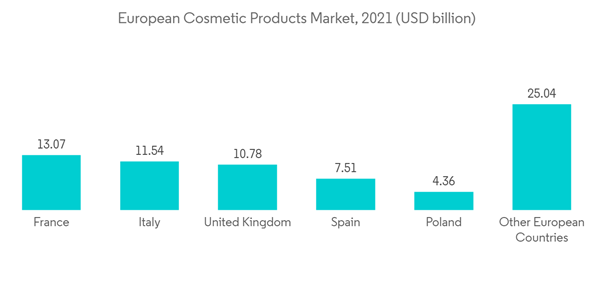 The European market has a robust and rising demand for cosmetics. The desire for high-quality, all-natural cosmetics is especially strong in Europe, making it one of the world's largest cosmetics marketplaces. According to Cosmetics Europe, the value of the European market for cosmetics and personal care products was above USD 85 billion in 2021, and Germany accounted for nearly 17% of the market.