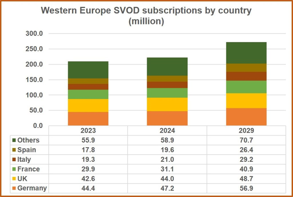 According to the forecasts, Western Europe's SVOD subscriptions are set to reach a staggering 273 million by 2029, marking an impressive increase from the 210 million recorded at the end of 2023. Delving deeper, the UK is expected to account for 6 million of the 63 million new additions. In contrast, Germany is projected to contribute 12 million, followed by France (11 million), Italy (10 million), and Spain (9 million).