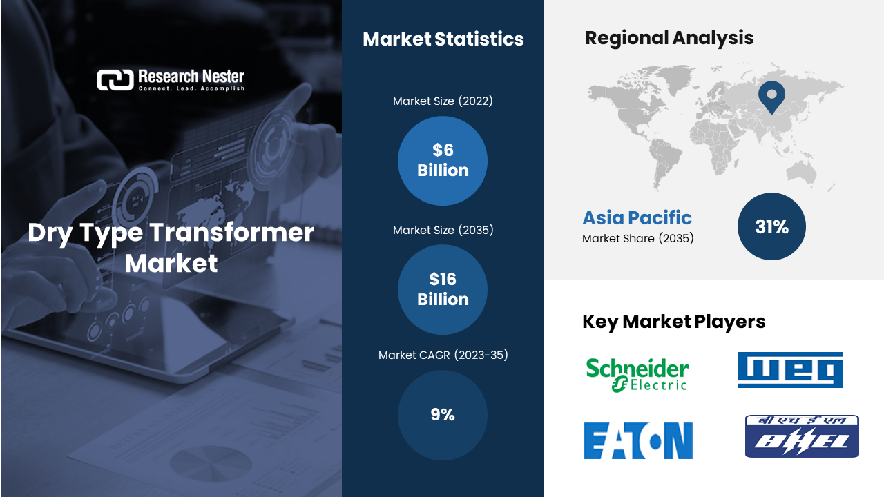 A few of the well-known industry leaders in dry type transformer market that are profiled by Research Nester are Siemens AG, WEG Industries, Eaton Corporation, Schneider Electric SE, Bharat Heavy Electricals Limited, Virginia Transformer Corp, General Electric Company, Hyosung Heavy Industries, Hammond Power Solutions Inc., ABB Ltd., and Hyundai Electric & Energy Systems Co., Ltd.