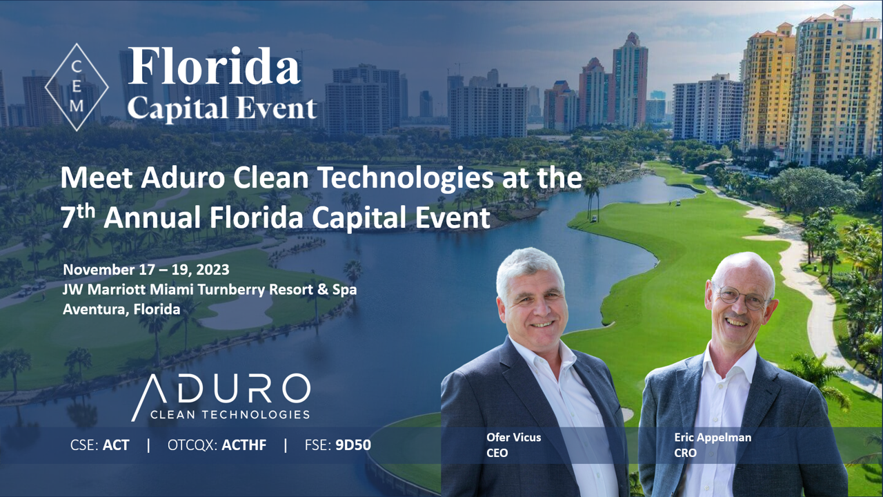 SARNIA, Ontario, Nov. 15, 2023 (GLOBE NEWSWIRE) -- Aduro Clean Technologies Inc. („Aduro“ oder das „Unternehmen“) (CSE: ACT) (OTCQX: ACTHF) (FSE: 9D50), ein kanadischer Entwickler von patentierten wasserbasierten Technologien zur chemischen Wiederverwertung von Kunststoffen und zur Umwandlung von schwerem Rohöl und erneuerbaren Ölen in neue Ressourcen und höherwertige Kraftstoffe, freut sich, seine Teilnahme am 7. jährlichen Florida Capital Event in Aventura, Florida, vom 17. bis 19. November 2023 bekanntzugeben, das von Capital Event Management Ltd, („CEM“) veranstaltet wird.