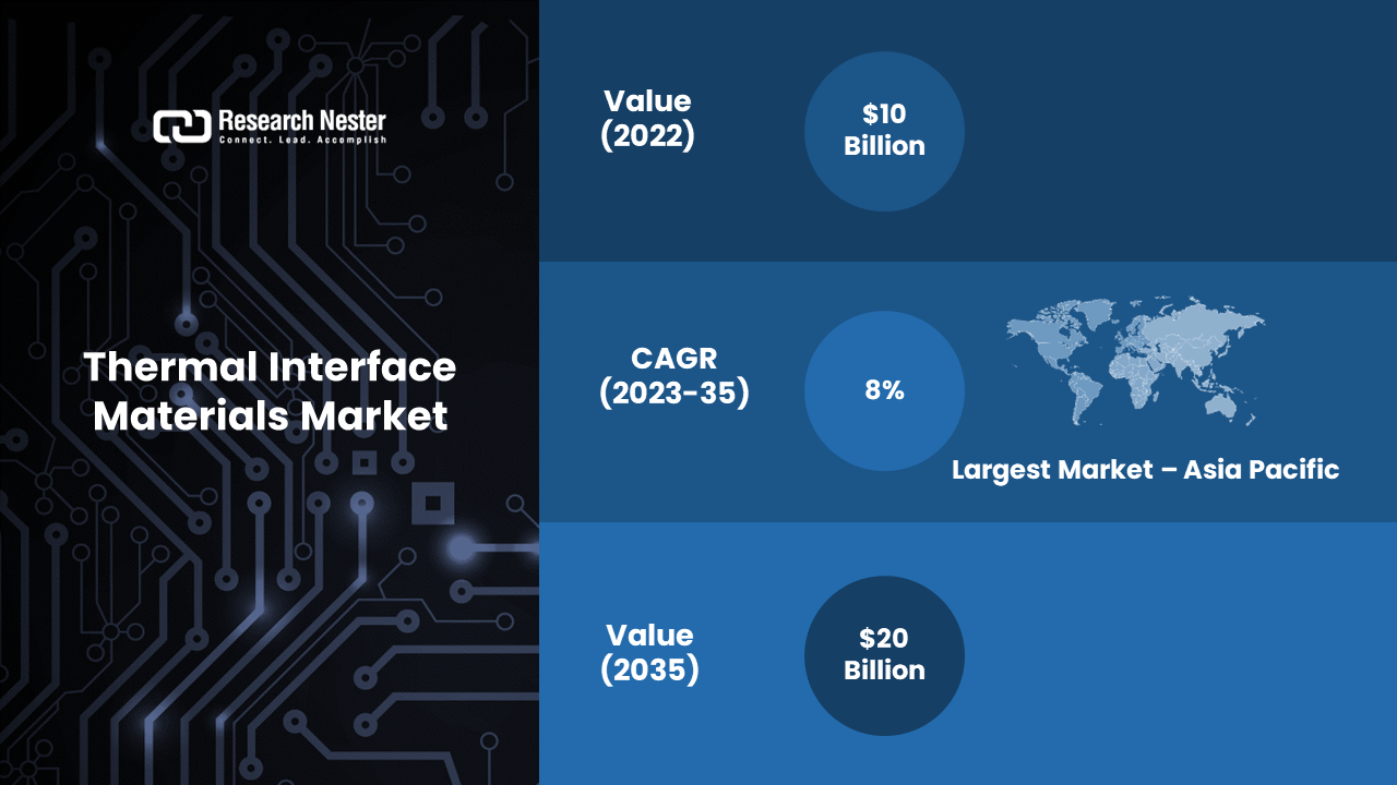 New York, Nov. 21, 2023 (GLOBE NEWSWIRE) -- The global thermal interface materials market size is projected to expand at ~8% CAGR between 2023 and 2035. The market is expected to garner a revenue of USD 20 billion by the end of 2035, up from a revenue of ~USD 10 billion in the year 2022.The market has been growing steadily due to the increasing demand for electronics and electronic components that generate significant amounts of heat. As electronic devices become more powerful and compact, managing heat becomes crucial to ensure their reliable and efficient operation. Thermal interface materials help bridge the gap between different materials' thermal conductivities, such as between a semiconductor chip and a heat sink.