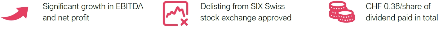- A strong operating profit (EBITDA) of CHF 16.5 million, largely covering taxes, depreciation and amortisation of CHF 4.5 million, of which CHF 3.8 million were related to goodwill amortisation.