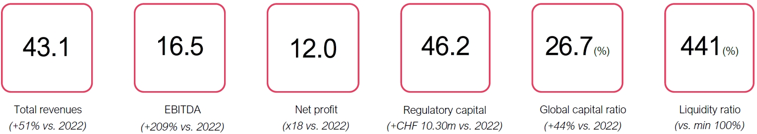 - A global capital ratio of 26.7% (vs 18.5% end-2022), reflecting a 29% increase in regulatory capital to CHF 46.2 million at end-2023 (vs. a minimum requirement of CHF 30 million).