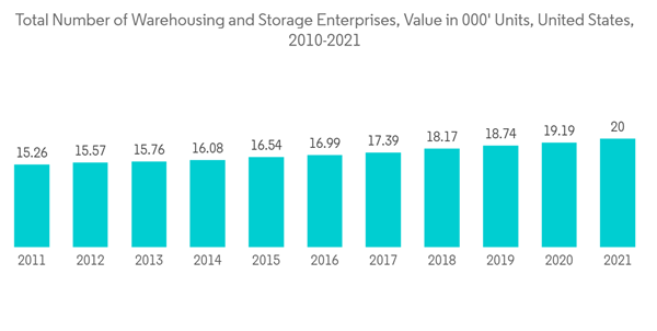 Meanwhile, in 2022, the growing inventories were expected to create a need for more than 500 million square feet of warehouse space in the country. Southern California also became a hub for the warehousing industry. The Inland Empire warehouse, which is in this area, is one of the busiest warehouses in the country and has one of the lowest vacancy rates on record. So, the growth of the contract logistics market is helped by the fact that the country has a strong network of warehouses. In addition, since 2010, the number of warehousing and storage businesses grew at an increasing rate every year. Also in 2021, there were more than 20,000 storage and warehousing businesses, which was a 4% increase from the year before.