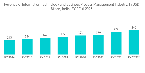- Also, according to NASSCOM India and MeitY India, The total revenue generated by the IT and BPM industry in India reached a significant amount of USD 227 billion in 2022 and is likely to reach USD 245 billion in 2023. The general upward trend observed during this period can primarily be attributed to the substantial influx of outsourcing from foreign companies.