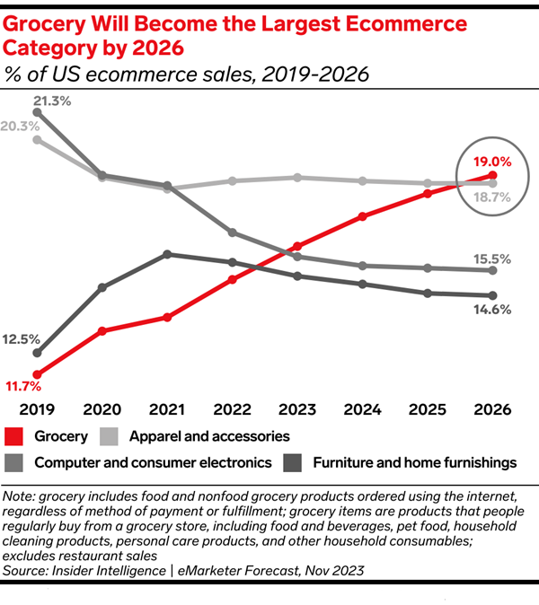 - Grocery Will Become the Largest Ecommerce Category by 2026 (% of US ecommerce sales, 2019-2026)