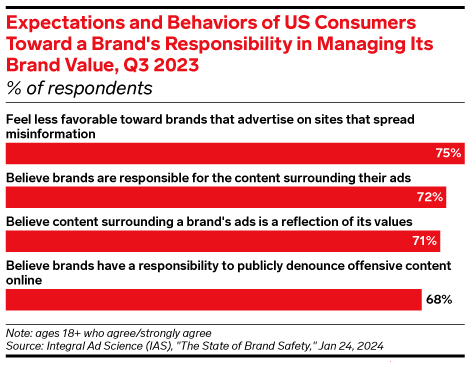 Key Stat: Bank marketers and advertisers need to worry about not only their ads' content, but also where they appear. Over half of consumers would stop using a brand if its ads ran next to inappropriate content, per a Q3 2023 Integral Ad Science (IAS) survey.
