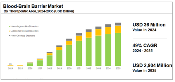 The Blood Brain Barrier Market is valued at USD 36 million in 2024 growing at a CAGR of 49% during the forecast period 2024-2035.